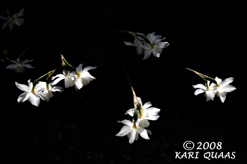 Five years ago, I made an image of white daffodils in my front yard in Seattle with the back light shining through. I then added contrast to the image to darken the background so the daffodils popped. I called that one “Daffy Dun Dillies” and sell it as a card. To me, it looks like they’re floating in space.