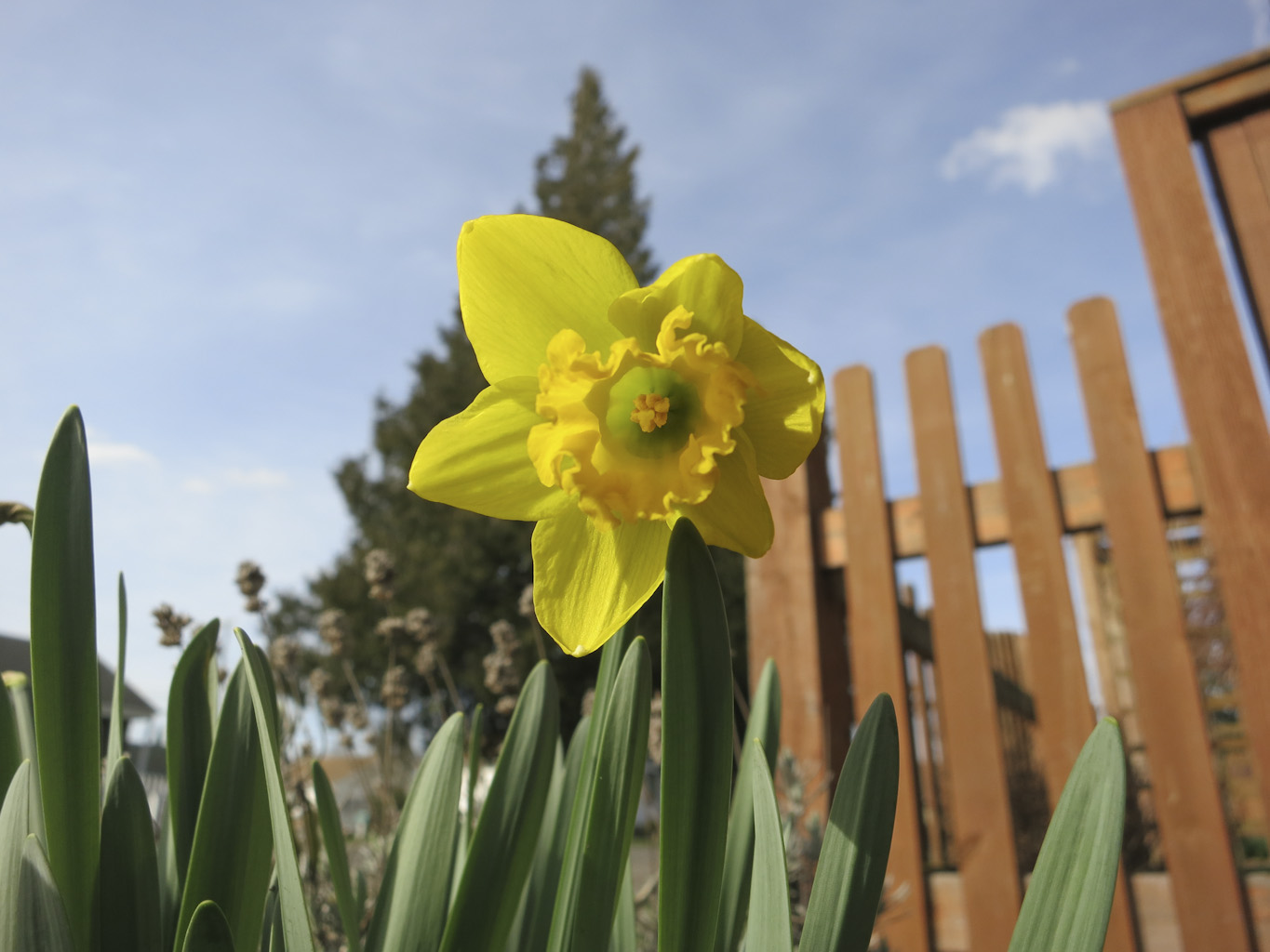 I work from home and sit in a room facing the street. At the end of the driveway, there is this little patch of daffodils, and with the sun out yesterday, I felt compelled to get out there and photograph them. Even today, with cloudy skies, they add a nice pop of color to my view.