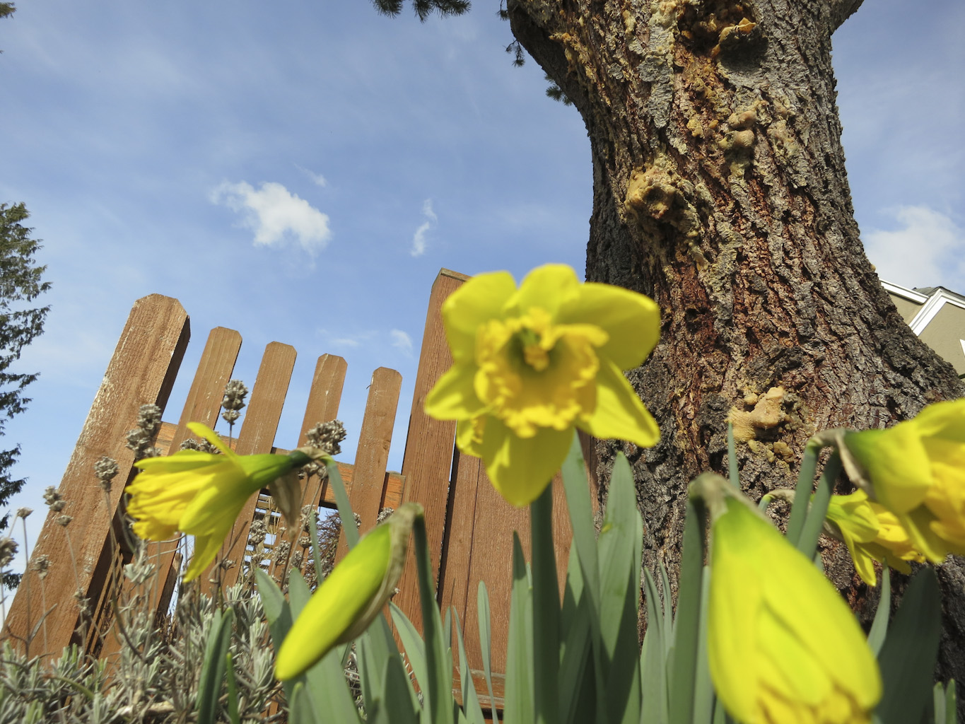 My favorite image is the second from the bottom where it appears like the tree has a face and is looking down proudly on the daffodils. I know, I’m reaching, but don’t you see the eye to the right, the lashes of the eye on the left, the nose and a little mouth? I do.