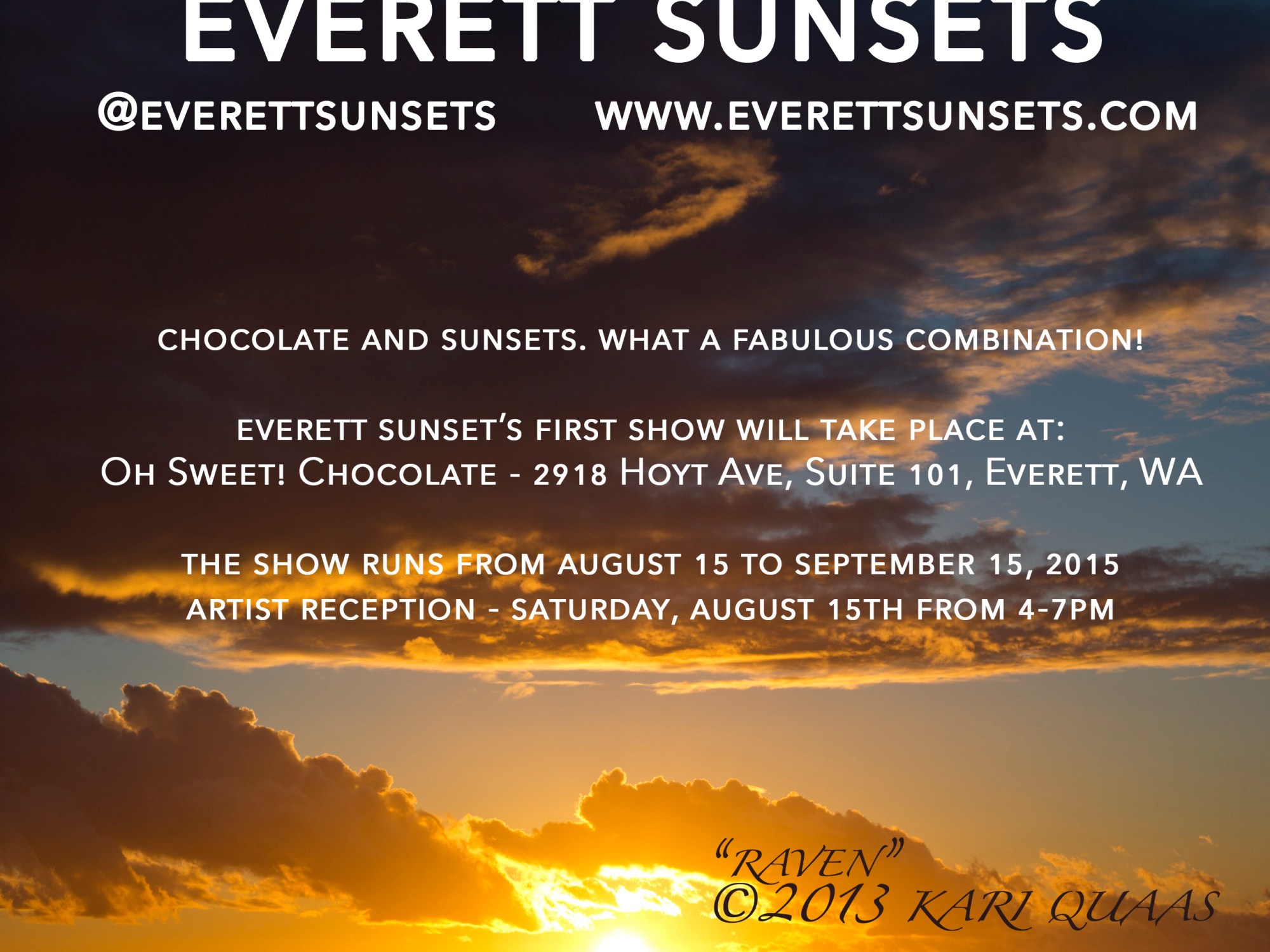 My sunset segment is throwing itself a party. Come to view some of my Everett Sunsets from August 15 to September 15, 2015 at Oh Sweet! Chocolate in Everett, WA. 🙂